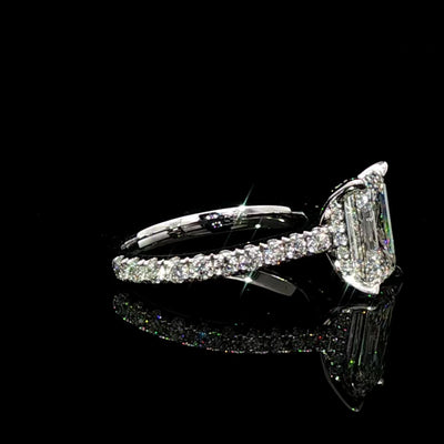 Our custom Alice 3/4 pave diamond band and hidden halo ring features a stunning 2.5ct Emerald Cut diamond, a 3/4 diamond pavé band, and a hidden halo for added brilliance set in your choice of metal.
