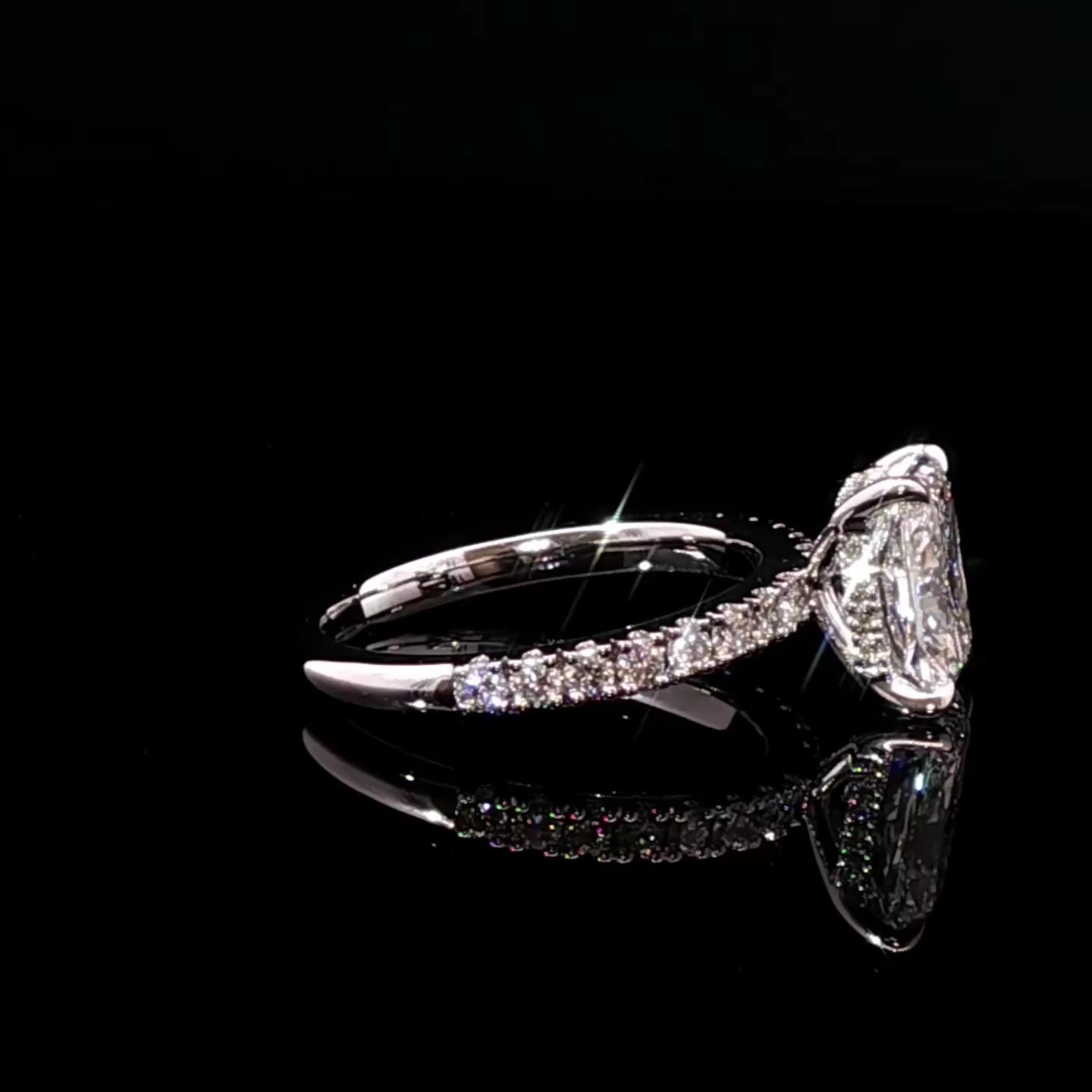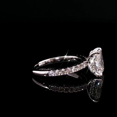 Our custom pave and hidden halo ring features a stunning 2.06ct Radiant diamond, a 1/2 diamond pavé band, and a hidden halo for added brilliance set in your 18k White Gold.